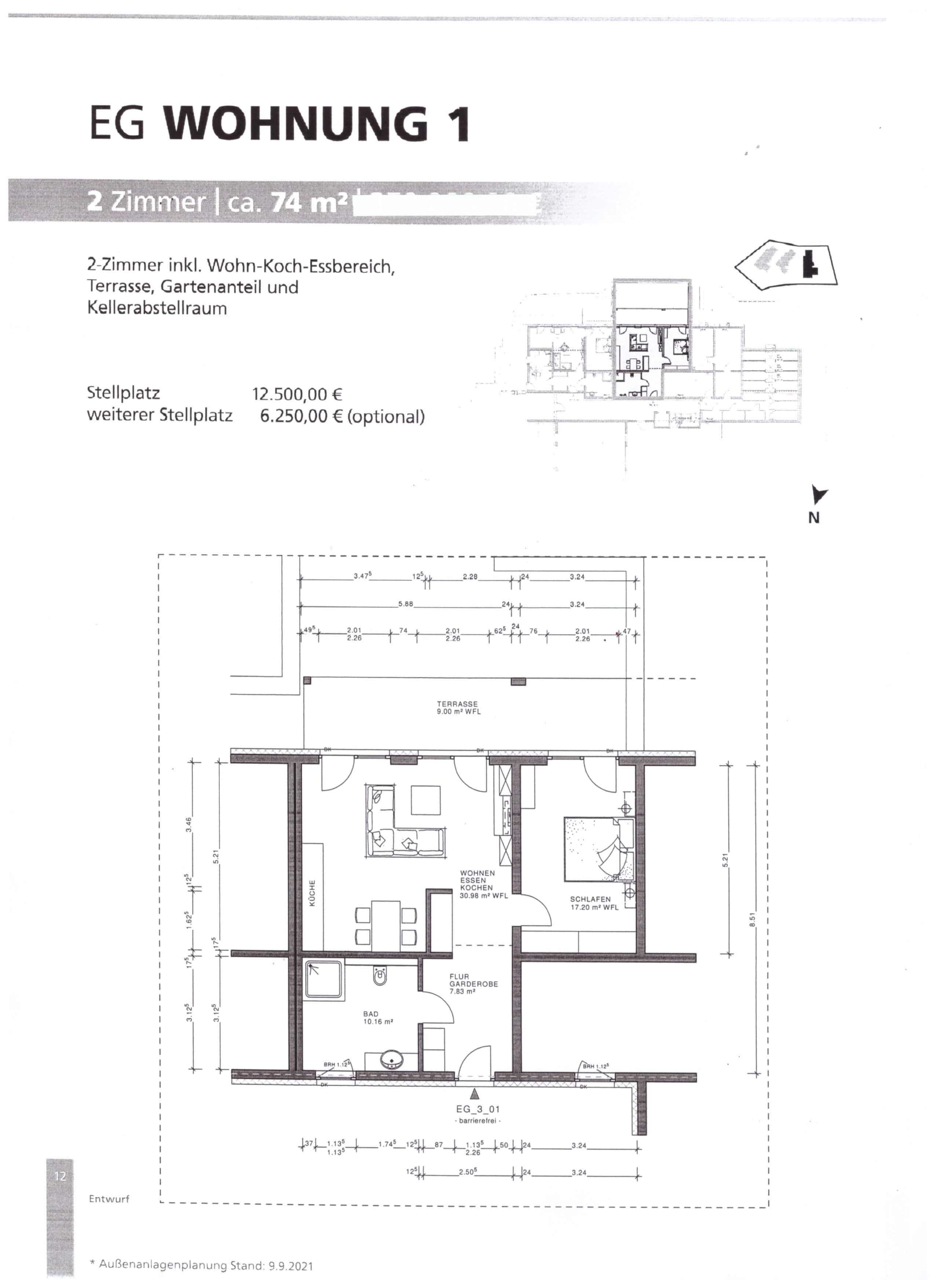 Zu jeder Wohnung muss ein Stellplatz (zzgl. 12.500,- €) erworben werden. Auf Wunsch ist ein weiterer Stellplatz für 6.250,-€ erhältlich. Für die Fahrräder steht ein abgeschlossener Raum im Erdgeschoss zur Verfügung.