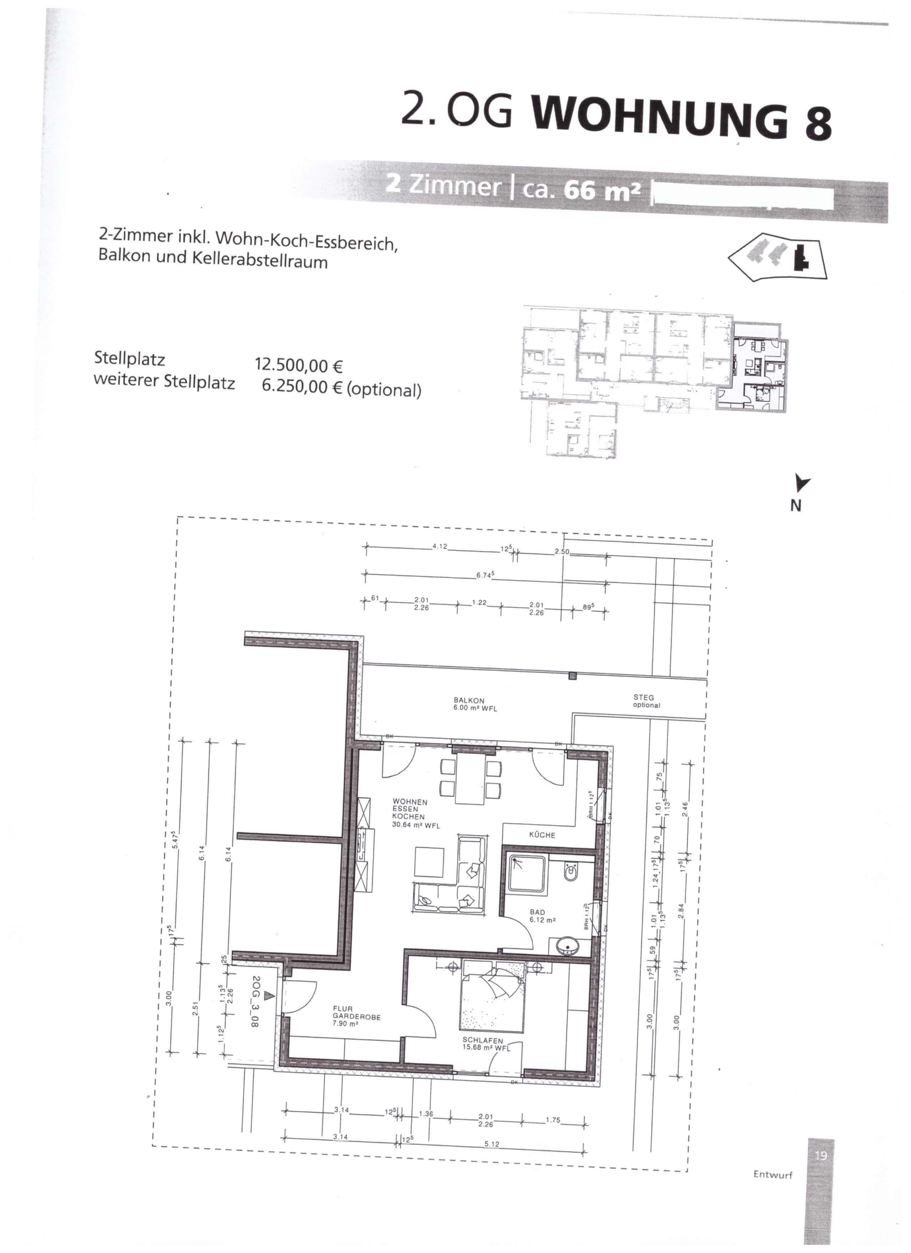 Zu jeder Wohnung muss ein Stellplatz (zzgl. 12.500,- €) erworben werden. Auf Wunsch ist ein weiterer Stellplatz für 6.250,-€ erhältlich. Für die Fahrräder steht ein abgeschlossener Raum im Erdgeschoss zur Verfügung.