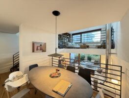 Das Wohnzimmer ist mit Einbaumöbeln, Spiegeln und Einbauregalen ausgestattet. Der Parkettboden sorgt für einen warmen, klassischen Look. Das Tageslichtbad ist hochwertig ausgestattet und bietet modernen Komfort. Die Bulthaup-Einbauküche ist funktional und stilvoll gestaltet.