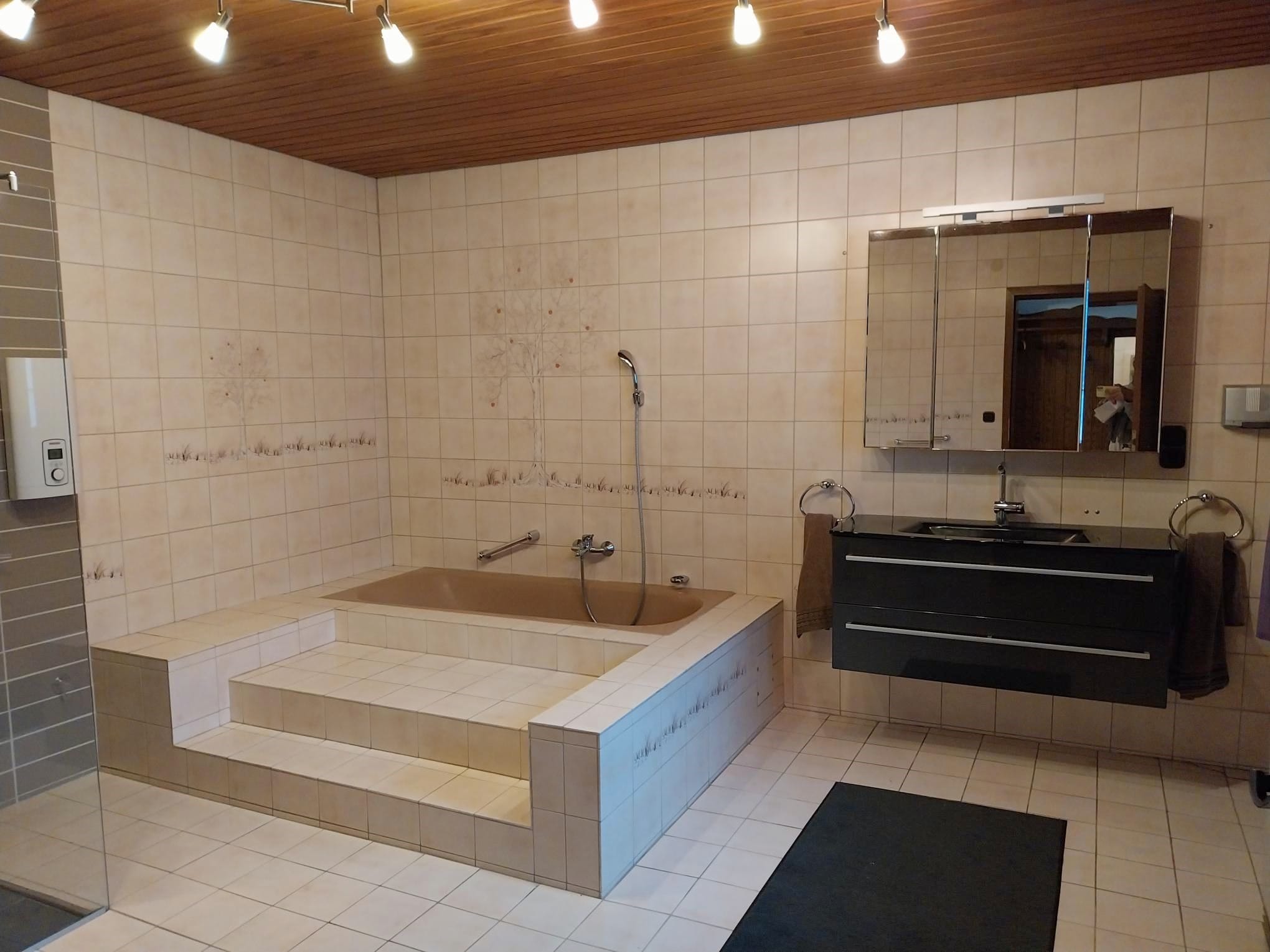 Eine halbe Etage höher betritt man den intregierten Anbau mit einem Gäste-WC und einem großen Bad mit Badewanne und ebenerdiger Dusche.