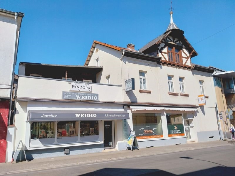 Im Anbau im EG befindet sich ein Juweliergeschäft auf 79m² mit einem Verkaufsraum, einer Werkstatt, einem kleinen Lager, einem Aufenthaltsraum und einem WC.