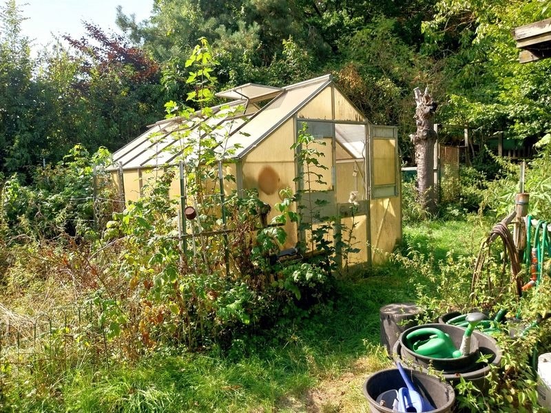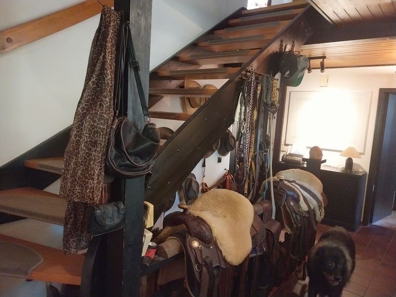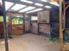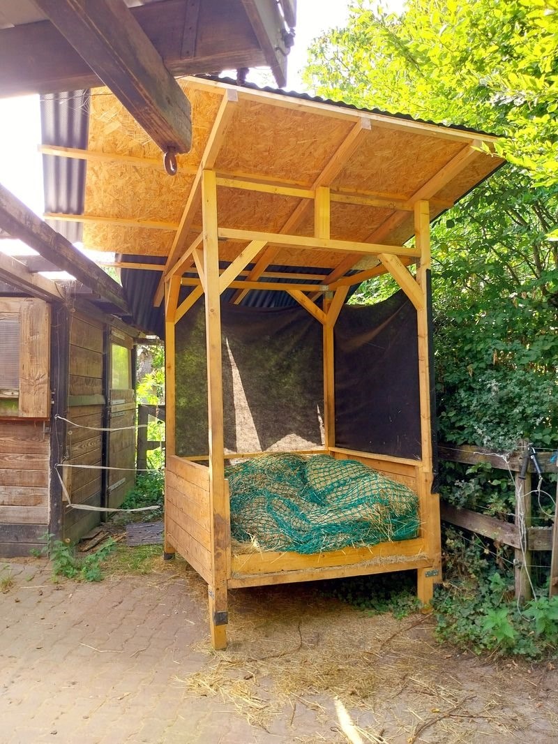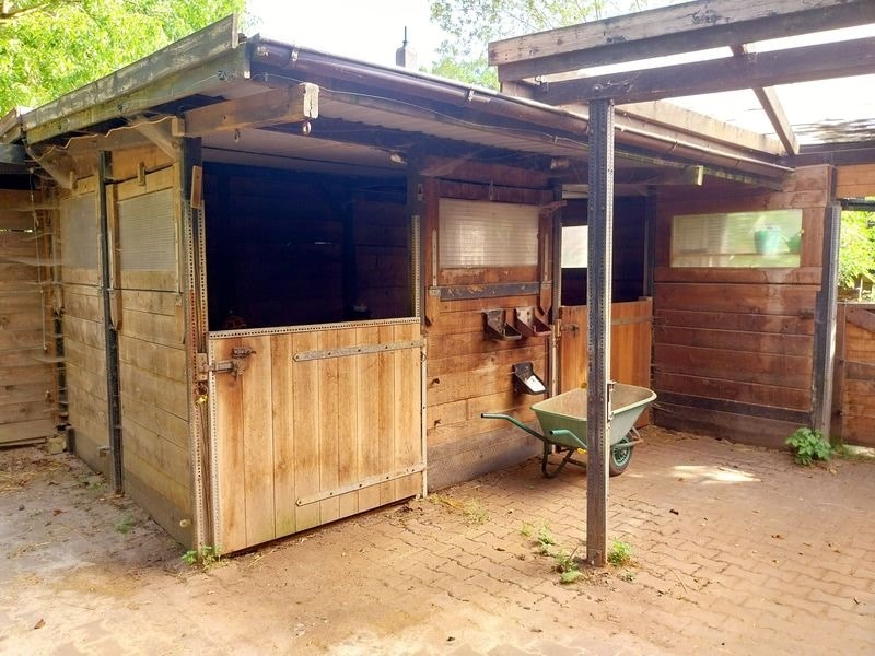 Im Außenbereich sind ein hohes Carport für ein Wohnmobil oder einen Anhänger, ein Hühnerstall mit Freigehege, ein Gewächshaus, ein Pferdestall mit 3 Außenboxen und einem überdachten, befestigten Auslauf mit Heuraufe, ein Gebäude für Futtervorräte und ein großer eingezäunter Sandauslauf.