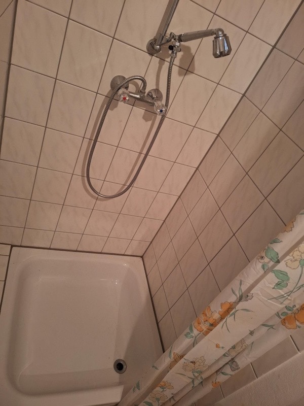 Ein kleines Appartement bietet eine Küche, Schlafzimmer und ein Duschbad.