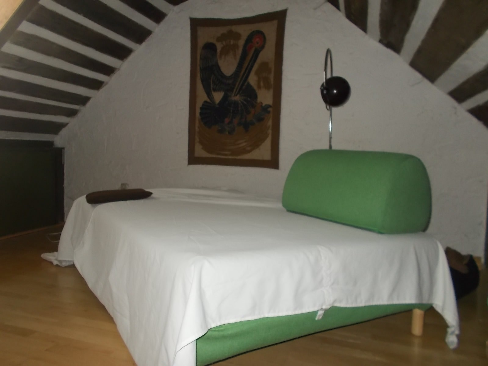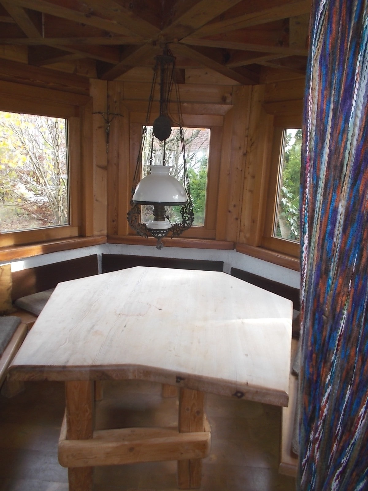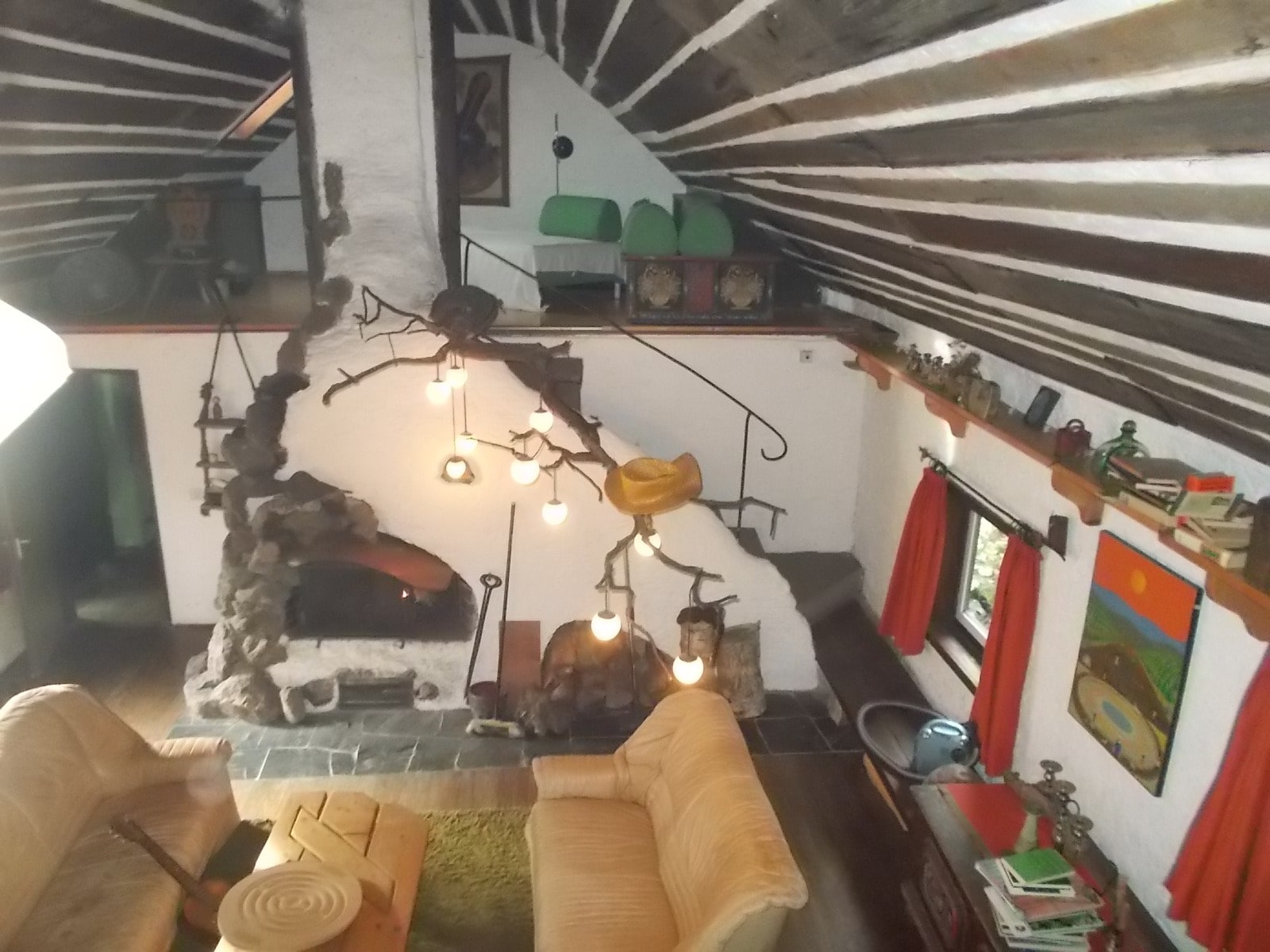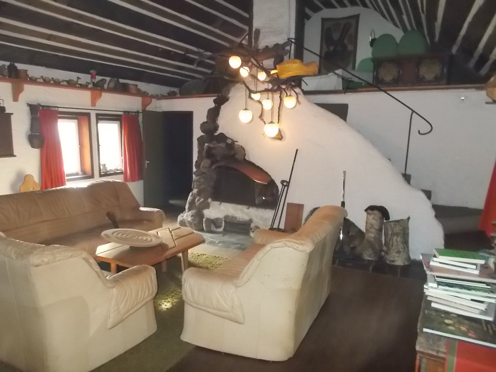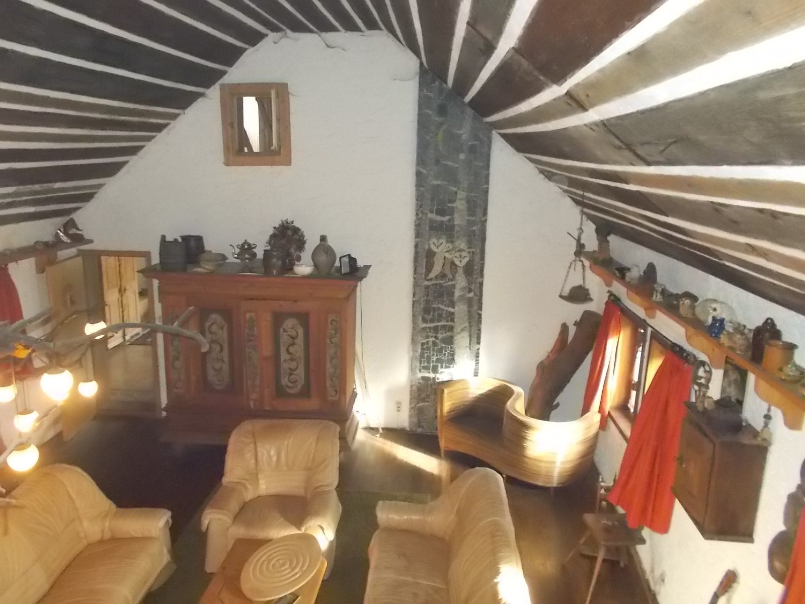 Das Haus scheint auf den ersten Blick klein zu sein, das ändert sich aber unmittelbar beim Betreten. Während Flur und Küche zunächst heimelig anmuten, öffnet sich der Wohnraum, ähnlich eines nordischen Hallenhauses. Der bis unter das Dach ausgebaute Raum wird mit einem offenen Kamin beheizt. Gemütlich auch die sich anschließende Empore. In der Verlängerung des Hauses schließt sich eine große Stube mit Kachelofen und Sitzerker an. Dazu kommen noch die zwei Schlafzimmer im Dachgeschoss.