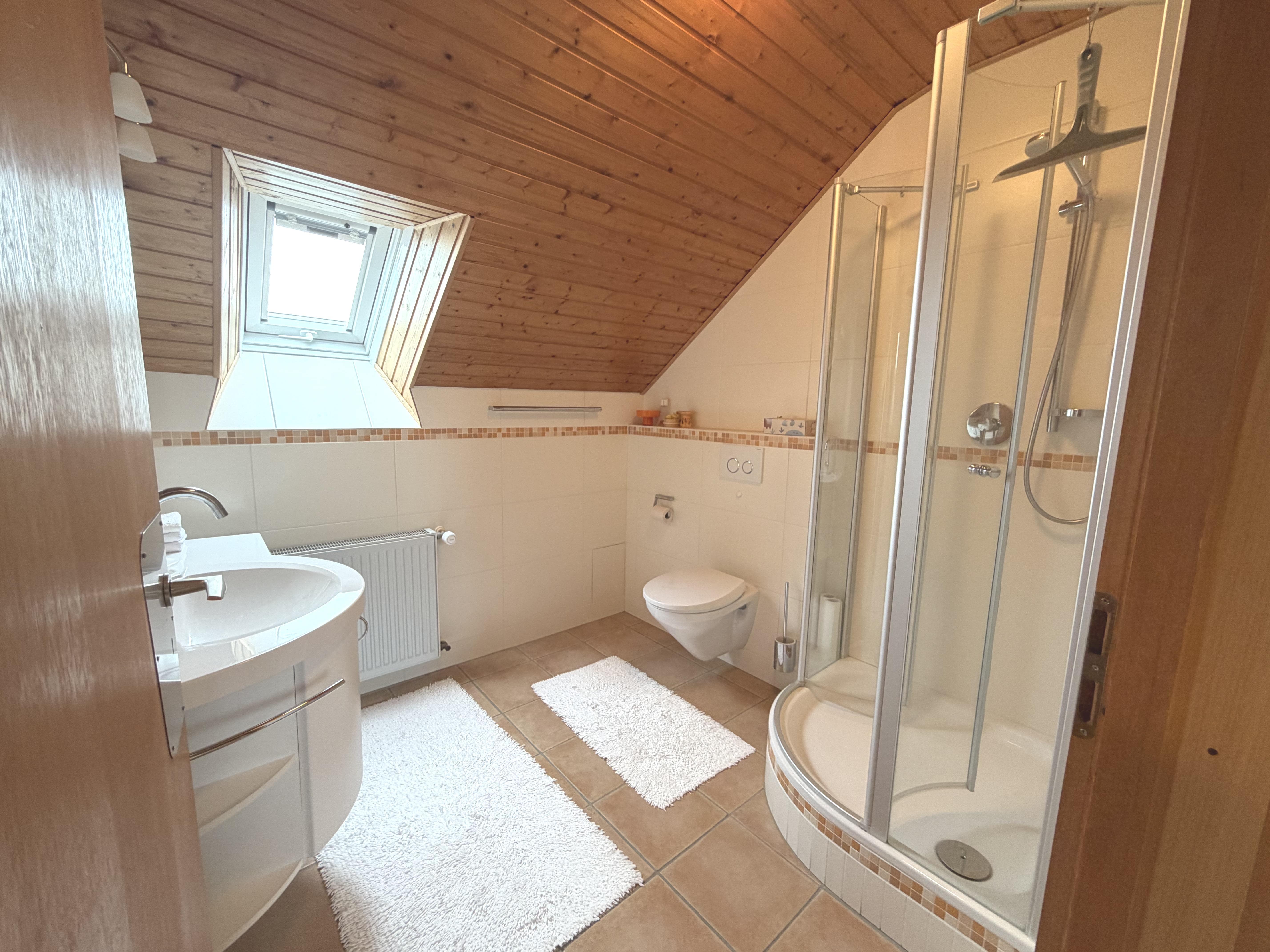Die gepflegte Immobilie wurde laufend von den derzeitigen Eigentümern instand gehalten und befindet sich in einem gepflegten Zustand. Im Erdgeschoss befinden sich neben dem Wohnzimmer noch zwei weitere Zimmer, ein Tagslichtbad mit Wanne und die Küche die mit einer Alno Einbauküche ausgestattet ist. Im Dachgeschosss befinden sich 2 Zimmer, ein Durchgangsraum und ein Tageslicht Duschbad aus dem Jahr 2010.