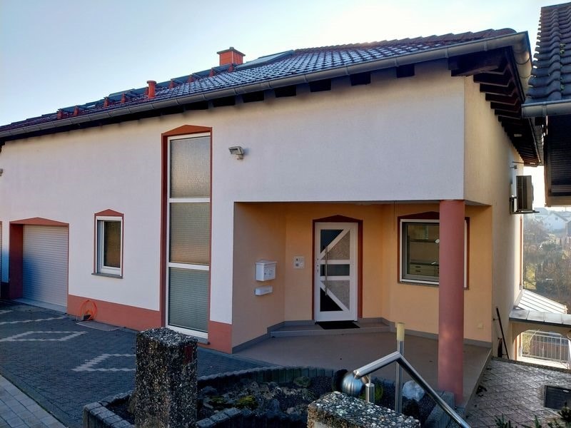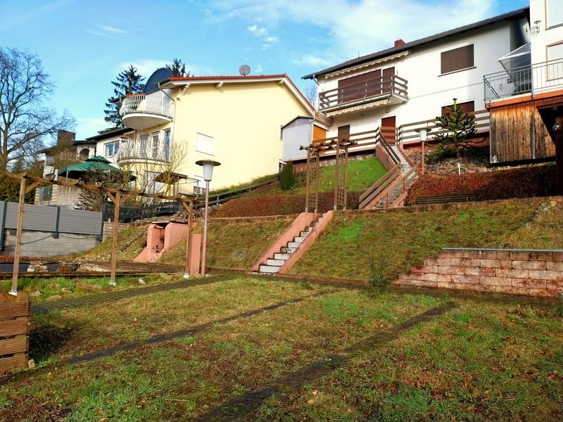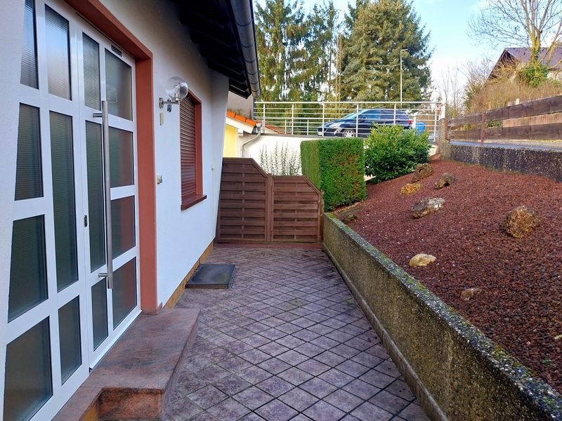 Durch die Hanglage befindet sich auf ca. 61m² eine Einliegerwohnung mit separatem Außenzugang mit einem Wohnzimmer, einem Schlafzimmer, einer Küche und einem Bad mit Dusche und Waschmaschinenanschluß.