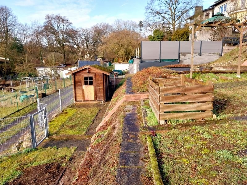 Das Grundstück ist terrassenförmig angelegt mit einem großen Teich, einigen Sitzbereichen, einem Geräteschuppen, einem Gartenhaus mit WC und einem großen Holzhaus mit Partyraum mit Theke.